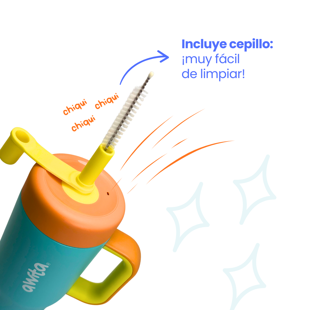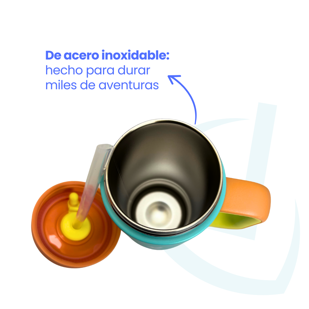 Su tapa hermética y la bombilla de silicona lo hacen resistente a derrames, y el acero inoxidable asegura un vaso duradero, seguro y libre de BPA. La asa ergonómica facilita que los niños lo lleven solos, y sus 530 ml garantizan hidratación durante todo el día. Además, sus piezas desmontables lo hacen muy fácil de lavar.